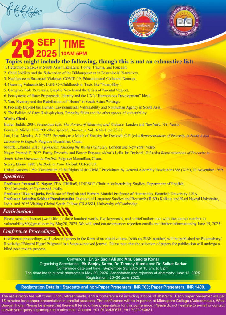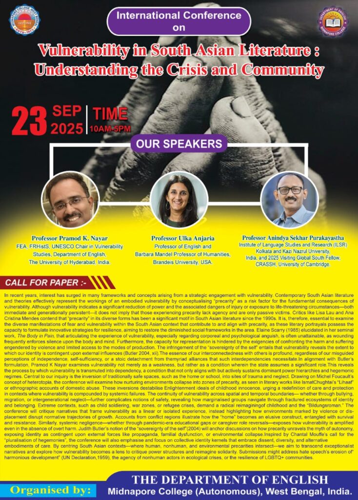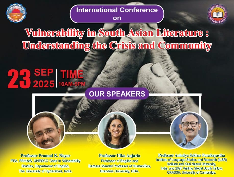 College Events | Notice International Conference on Vulnerability in South Asian Literature: Understanding the Crisis and Community ByMidnapore College April 28, 2025April 28, 2025 Vulnerability in South Asian Literature Understanding the Crisis and Community Download